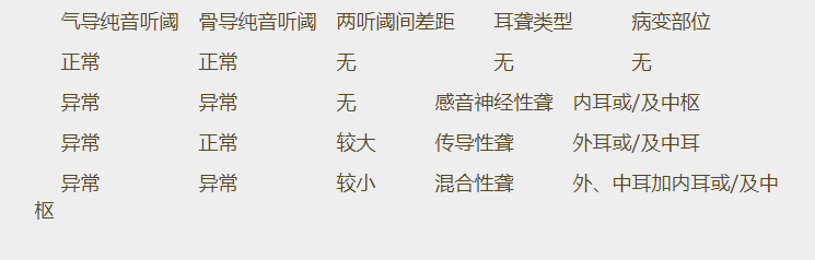 純音聽力檢查結果體現為純音聽力圖。</p><p> 正常情況下我們是通過兩條途徑來感受聲音信號的——氣導途徑和骨導途徑。前者我們非常熟悉,從外耳到中耳到內耳到聽中樞;后者我們或許不太注意:從顱骨直接到內耳到聽中樞。相應地,純音聽力檢查也有兩種聲音剌激方式,氣導輸入和骨導輸入。前者我們天天使用,而后者則很少被我們使用。事實上,兩閾值曲線的異同正是我們判斷聽損病變部位的基礎(見下表)。了解患者病變部位對于獲得他們的信任以及確定助聽器電聲性能都有非同尋常的意義。因此,有條件的時候還是應當重視骨導聽閾測試。</p><p style="text-align: center;"><img src="/upfiles/201906100237368907.png" alt="" /><br /></p><p> 更多詳情請登錄聽覺有道助聽器m.gfjzc.com</p>" />