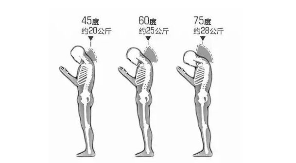 研究數據表示,當人在低頭45度時,頸椎就得擔當起22公斤的“大任”;當頭低到60度的時候,你的頸椎則要承受25公斤的重量。這可不是個小數目,它甚至已經超過了7歲小孩的平均體重。