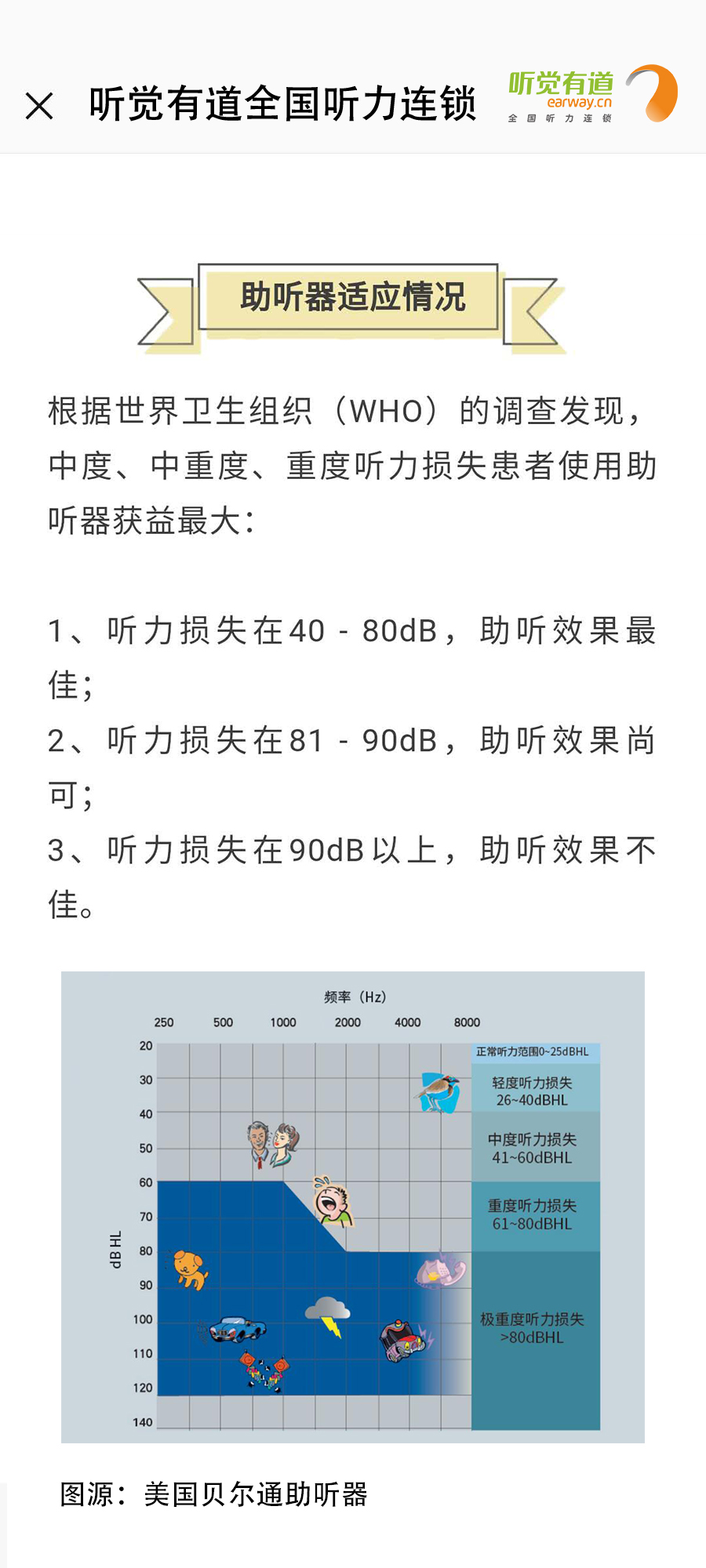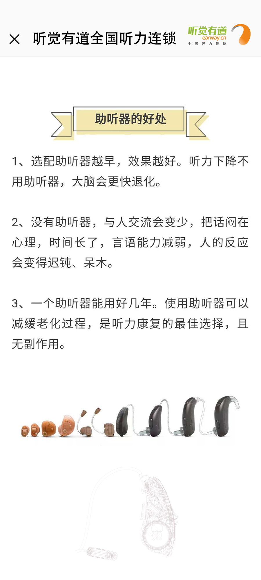 什么是助聽器?長什么樣子?有什么作用?如何使用?這里一一告訴您!</p><p> 助聽器是聽力障礙者使用的輔具,用來補足聽力損傷所造成的缺陷。廣義上講凡能有效地把聲音傳入耳朵的各種裝置都可以看作為助聽器,狹義上講助聽器是一個電聲放大器,通過它將聲音放大,使聽障者聽到了原來聽不清楚、聽不到的聲音。</p><p> 第一:助聽器的種類</p><p style="text-align: center;"><img src="/upfiles/201901180318143583.jpg" width="640" alt="" /><br /></p><p> 第二:助聽器的好處</p><p style="text-align: center;"><img src="/upfiles/201901180318334139.png" width="640" alt="" /><br /></p><p> 第三:如何適應助聽器</p><p style="text-align: center;"><img src="/upfiles/201901180318506440.jpg" width="640" alt="" /><br /></p><p> 第四:選配助聽器流程</p><p style="text-align: center;"><img src="/upfiles/201901180319039646.jpg" width="640" alt="" /><br /></p><p style="text-align: center;"><br /></p><p> 更多詳情請登錄m.gfjzc.com</p>" />