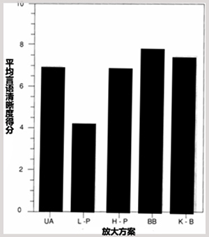 我們發現沒有補償(UA),寬頻(BB),高通(HP),K-Bass(KB)的平均言語清晰度都大于低通(LP)的平均言語清晰度。