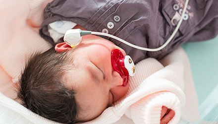 耳聲發射測試中,將耳機插入新生兒的耳朵即可給聲測試,測試時間較短且對孩子沒有刺激。