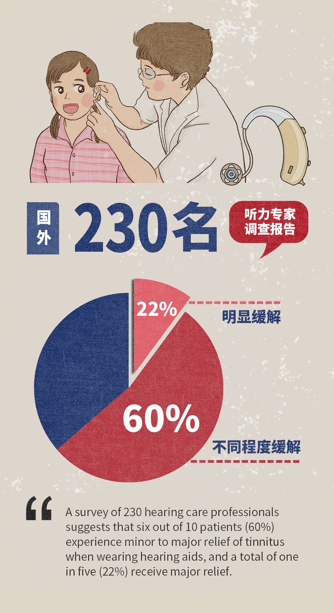60%的患者通過佩戴助聽器,耳鳴可以得到不同程度的緩解;近22%的患者通過佩戴助聽器,耳鳴可以得到明顯的緩解。
