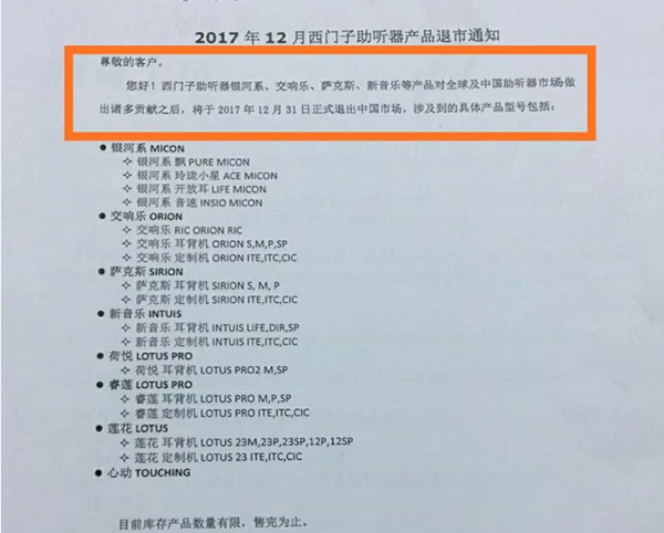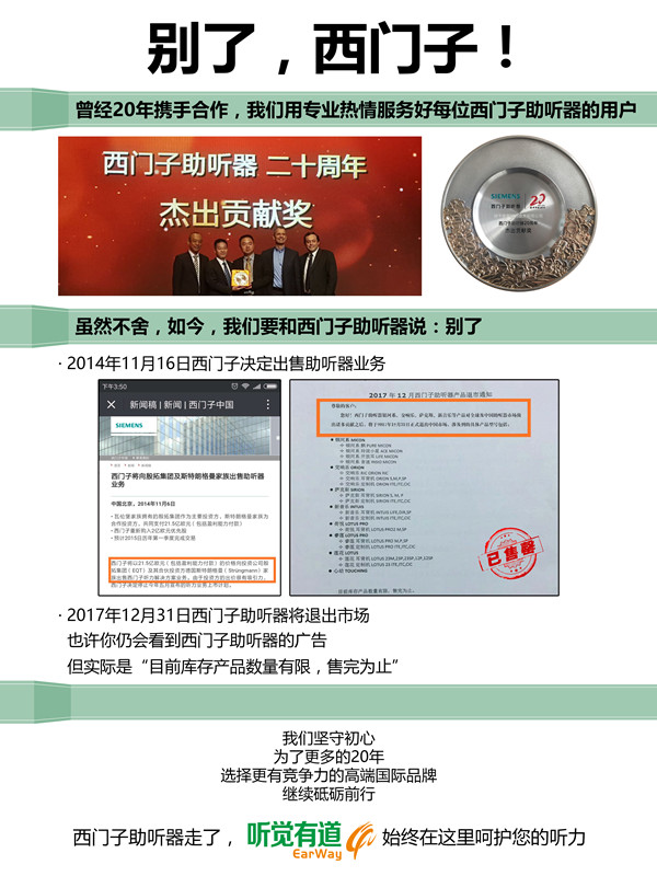 <p microsoft="" yahei="" ui="" simsun="" segoe="" tahoma="" helvetica="" sans-serif="" font-size:="" 14px="" text-align:="" center="" style="padding: 5px 0px; margin: 0px; color: rgb(51, 51, 51); font-family: "Microsoft YaHei UI", "Microsoft YaHei", SimSun, "Segoe UI", Tahoma, Helvetica, sans-serif; font-size: 16px; text-align: center;"><img src="http://m.gfjzc.com/upfiles/201712110502357735.jpg" alt="" style="border: 0px;" /></p><p microsoft="" yahei="" ui="" simsun="" segoe="" tahoma="" helvetica="" sans-serif="" font-size:="" 14px="" text-align:="" center="" style="padding: 5px 0px; margin: 0px; color: rgb(51, 51, 51); font-family: "Microsoft YaHei UI", "Microsoft YaHei", SimSun, "Segoe UI", Tahoma, Helvetica, sans-serif; font-size: 16px; text-align: center;"><br /></p><p microsoft="" yahei="" ui="" simsun="" segoe="" tahoma="" helvetica="" sans-serif="" font-size:="" 14px="" text-align:="" center="" style="padding: 5px 0px; margin: 0px; color: rgb(51, 51, 51); font-family: "Microsoft YaHei UI", "Microsoft YaHei", SimSun, "Segoe UI", Tahoma, Helvetica, sans-serif; font-size: 16px; text-align: center;"><img src="http://m.gfjzc.com/upfiles/201712201117438957.jpg" alt="" style="border: 0px;" /><br /></p><p microsoft="" yahei="" ui="" simsun="" segoe="" tahoma="" helvetica="" sans-serif="" font-size:="" 14px="" text-align:="" center="" style="padding: 5px 0px; margin: 0px; color: rgb(51, 51, 51); font-family: "Microsoft YaHei UI", "Microsoft YaHei", SimSun, "Segoe UI", Tahoma, Helvetica, sans-serif; font-size: 16px; text-align: center;"><br /></p><p microsoft="" yahei="" ui="" simsun="" segoe="" tahoma="" helvetica="" sans-serif="" font-size:="" 14px="" text-align:="" center="" style="padding: 5px 0px; margin: 0px; color: rgb(51, 51, 51); font-family: "Microsoft YaHei UI", "Microsoft YaHei", SimSun, "Segoe UI", Tahoma, Helvetica, sans-serif; font-size: 16px; text-align: center;">2014年11月16日西門子決定出售助聽器業務</p><p microsoft="" yahei="" ui="" simsun="" segoe="" tahoma="" helvetica="" sans-serif="" font-size:="" 14px="" text-align:="" center="" style="padding: 5px 0px; margin: 0px; color: rgb(51, 51, 51); font-family: "Microsoft YaHei UI", "Microsoft YaHei", SimSun, "Segoe UI", Tahoma, Helvetica, sans-serif; font-size: 16px; text-align: center;"> </p><center microsoft="" yahei="" ui="" simsun="" segoe="" tahoma="" helvetica="" sans-serif="" font-size:="" 14px="" style="color: rgb(51, 51, 51); font-family: "Microsoft YaHei UI", "Microsoft YaHei", SimSun, "Segoe UI", Tahoma, Helvetica, sans-serif; font-size: 16px;"><img src="http://m.gfjzc.com/upfiles/20171211050740709.jpg" alt="" style="border: 0px;" /><br /></center><center microsoft="" yahei="" ui="" simsun="" segoe="" tahoma="" helvetica="" sans-serif="" font-size:="" 14px="" style="color: rgb(51, 51, 51); font-family: "Microsoft YaHei UI", "Microsoft YaHei", SimSun, "Segoe UI", Tahoma, Helvetica, sans-serif; font-size: 16px;"><br /></center><p microsoft="" yahei="" ui="" simsun="" segoe="" tahoma="" helvetica="" sans-serif="" font-size:="" 14px="" text-align:="" center="" style="padding: 5px 0px; margin: 0px; color: rgb(51, 51, 51); font-family: "Microsoft YaHei UI", "Microsoft YaHei", SimSun, "Segoe UI", Tahoma, Helvetica, sans-serif; font-size: 16px; text-align: center;">2017年12月31日西門子助聽器將正式退出中國市場</p><p microsoft="" yahei="" ui="" simsun="" segoe="" tahoma="" helvetica="" sans-serif="" font-size:="" 14px="" text-align:="" center="" style="padding: 5px 0px; margin: 0px; color: rgb(51, 51, 51); font-family: "Microsoft YaHei UI", "Microsoft YaHei", SimSun, "Segoe UI", Tahoma, Helvetica, sans-serif; font-size: 16px; text-align: center;"> </p><center microsoft="" yahei="" ui="" simsun="" segoe="" tahoma="" helvetica="" sans-serif="" font-size:="" 14px="" style="color: rgb(51, 51, 51); font-family: "Microsoft YaHei UI", "Microsoft YaHei", SimSun, "Segoe UI", Tahoma, Helvetica, sans-serif; font-size: 16px;"><img src="http://m.gfjzc.com/upfiles/201712110508305244.png" alt="" style="border: 0px;" /><br /></center><center microsoft="" yahei="" ui="" simsun="" segoe="" tahoma="" helvetica="" sans-serif="" font-size:="" 14px="" style="color: rgb(51, 51, 51); font-family: "Microsoft YaHei UI", "Microsoft YaHei", SimSun, "Segoe UI", Tahoma, Helvetica, sans-serif; font-size: 16px;"><br /></center><p microsoft="" yahei="" ui="" simsun="" segoe="" tahoma="" helvetica="" sans-serif="" font-size:="" 14px="" text-align:="" center="" style="padding: 5px 0px; margin: 0px; color: rgb(51, 51, 51); font-family: "Microsoft YaHei UI", "Microsoft YaHei", SimSun, "Segoe UI", Tahoma, Helvetica, sans-serif; font-size: 16px; text-align: center;">銀河系、交響樂、薩克斯、新音樂、荷悅、睿蓮、蓮花、心動……</p><p microsoft="" yahei="" ui="" simsun="" segoe="" tahoma="" helvetica="" sans-serif="" font-size:="" 14px="" text-align:="" center="" style="padding: 5px 0px; margin: 0px; color: rgb(51, 51, 51); font-family: "Microsoft YaHei UI", "Microsoft YaHei", SimSun, "Segoe UI", Tahoma, Helvetica, sans-serif; font-size: 16px; text-align: center;">西門子助聽器系列產品悉數退市</p><p microsoft="" yahei="" ui="" simsun="" segoe="" tahoma="" helvetica="" sans-serif="" font-size:="" 14px="" text-align:="" center="" style="padding: 5px 0px; margin: 0px; color: rgb(51, 51, 51); font-family: "Microsoft YaHei UI", "Microsoft YaHei", SimSun, "Segoe UI", Tahoma, Helvetica, sans-serif; font-size: 16px; text-align: center;"> </p><center microsoft="" yahei="" ui="" simsun="" segoe="" tahoma="" helvetica="" sans-serif="" font-size:="" 14px="" style="color: rgb(51, 51, 51); font-family: "Microsoft YaHei UI", "Microsoft YaHei", SimSun, "Segoe UI", Tahoma, Helvetica, sans-serif; font-size: 16px;"><img src="http://m.gfjzc.com/upfiles/201712110509096639.jpg" alt="" style="border: 0px;" /><br /></center><p microsoft="" yahei="" ui="" simsun="" segoe="" tahoma="" helvetica="" sans-serif="" font-s