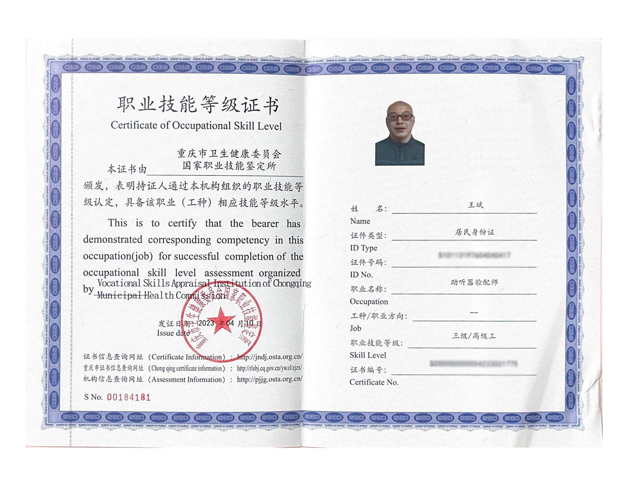 <span style="white-space:pre"> </span>熱烈祝賀聽(tīng)覺(jué)有道全國(guó)聽(tīng)力連鎖聽(tīng)力專家王斌、王杰、蔣方琴和任會(huì)敏榮獲國(guó)家認(rèn)證三級(jí)助聽(tīng)器驗(yàn)配師職業(yè)資格證書(shū)!<br /><br /> <strong>驗(yàn)配師職業(yè)資格證書(shū)</strong><br /><br /> 助聽(tīng)器驗(yàn)配師是一個(gè)有技術(shù)深度的職業(yè),對(duì)聽(tīng)力知識(shí)儲(chǔ)備和實(shí)踐操作熟練度都有一定要求。<br /><br /> 這張由國(guó)家機(jī)構(gòu)認(rèn)證頒發(fā)的驗(yàn)配師職業(yè)資格證書(shū),正是最具權(quán)威性和直觀公平的評(píng)判標(biāo)準(zhǔn)。<br /><br /></span><p><span style="font-size:16px;"> 本次三級(jí)助聽(tīng)器驗(yàn)配師職業(yè)技能等級(jí)認(rèn)定,聽(tīng)覺(jué)有道參與人數(shù)4人,通過(guò)認(rèn)定4人,通過(guò)率為100%!</span></p><p><span style="font-size:16px;"><br /></span></p><p style="text-align: center;"><img src="/upfiles/20230511114521111.gif" width="640" alt="" /><br /></p><p style="text-align: center;"><br /></p><span style="font-size:16px;"><strong> 千里之行,始于足下</strong><br /><br /> 參與等級(jí)認(rèn)定的人員中,有認(rèn)真嚴(yán)謹(jǐn)?shù)膮^(qū)域運(yùn)營(yíng)經(jīng)理,深受歡迎的區(qū)域技術(shù)培訓(xùn)主管,顏值實(shí)力并存的區(qū)域負(fù)責(zé)人以及非常資深的兒童聽(tīng)力專家。<br /><br /> 他們都有共同的身份:一名優(yōu)秀的助聽(tīng)器驗(yàn)配師。<br /><br /> 事實(shí)上,他們的實(shí)力早已達(dá)到三級(jí)助聽(tīng)器驗(yàn)配師的標(biāo)準(zhǔn)。本次出征,信心滿滿,底氣十足,凱旋而歸!<br /></span><p style="text-align: center;"><img src="/upfiles/202305111145405493.jpg" width="640" alt="" /><br /></p><span style="font-size:16px;"> <strong>奮楫篤行,臻于至善</strong><br /><br /> 該職業(yè)技能等級(jí)證書(shū)由重慶市衛(wèi)生健康委員會(huì)國(guó)家職業(yè)技能鑒定所頒發(fā)。該鑒定所也是2020年底助聽(tīng)器驗(yàn)配師考試改革后,全國(guó)備案成功的首家衛(wèi)健委系統(tǒng)鑒定機(jī)構(gòu),具有權(quán)威性。<br /><br /> 聽(tīng)覺(jué)有道深耕聽(tīng)力行業(yè)20多年,一直致力人才培養(yǎng),提升全體驗(yàn)配師的綜合業(yè)務(wù)能力,用專業(yè)、規(guī)范的技能解決聽(tīng)損人士的問(wèn)題,助其重新聆聽(tīng),感受世界的美好!<br /><br /></span><p><span style="font-size:16px;"> 期待全體驗(yàn)配師向優(yōu)秀榜樣學(xué)習(xí)!行而不輟,履踐致遠(yuǎn)!</span></p><p><span style="font-size:16px;"><br /></span></p><p style="text-align: center;"><img src="/upfiles/202305111145592511.jpg" width="640" alt="" /><br /></p>" />
